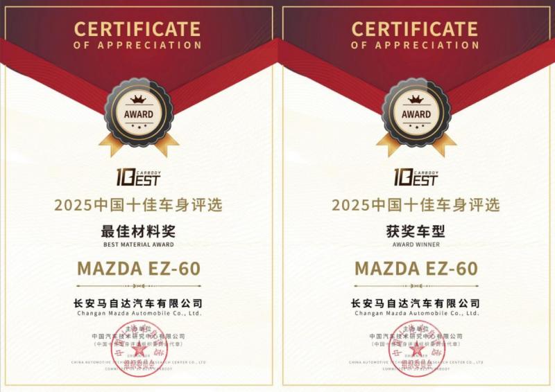 “中国十佳车身”评选是国内车身技术领域的最高荣誉,评选标准涵盖结构强度、制造工艺、材料创新等六大维度。EZ-60凭借领先的车身技术斩获“2025十佳车身”与“最佳材料”双奖。长安马自达作为钢铁巨头宝钢20年战略合作伙伴,EZ-60的每一片钢材都可追溯源头,车顶横梁更是采用双方联合开发的1470MPa世界最高强度冷冲压件,用技术创新构筑安全根基。整车7横5纵的笼式铠甲车身中,86.5%为高强钢,其中27.45%是热成型钢,最高强度达2000MPa,超1500MPa的超高强度零件集群多达50个,形成密集的安全防护网。