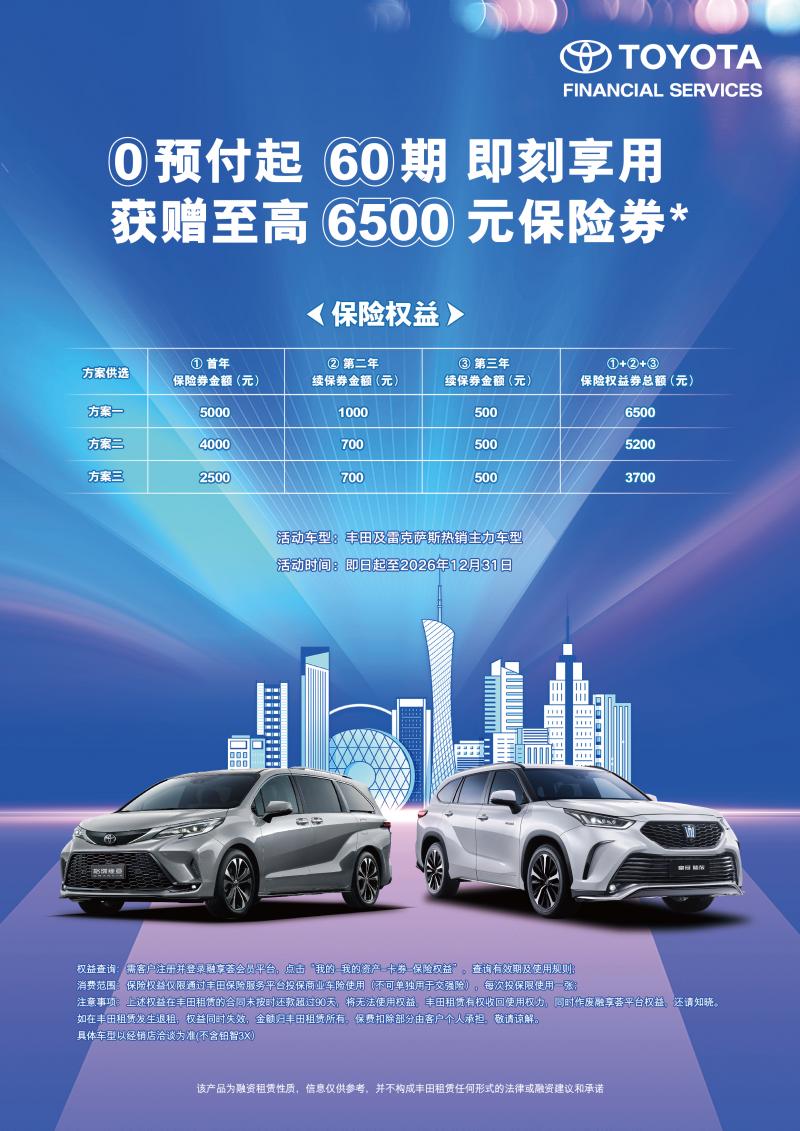 围绕“全程无忧”理念,此次丰田租赁推出的全新产品,整合了用车过程中的诸多关键环节,旨在为用户提供覆盖车辆使用全周期的服务保障。其中的核心亮点之一,是融资租赁方案中所提供的附加保险权益,覆盖几乎所有的丰田及雷克萨斯品牌主力热销车型。相较于其他租赁产品大多只聚焦于满足用户的“资金周转”需求,丰田租赁充分考虑到用户后续用车过程中的保障需求,特别推出包含首年保险及第二、三年续保在内的保险权益计划。用户可根据所选方案享受相应金额的保障支持,至高可获6500元保险抵扣券。此方案可在降低保险支出的同时,提前将车辆的保险进行有效规划。